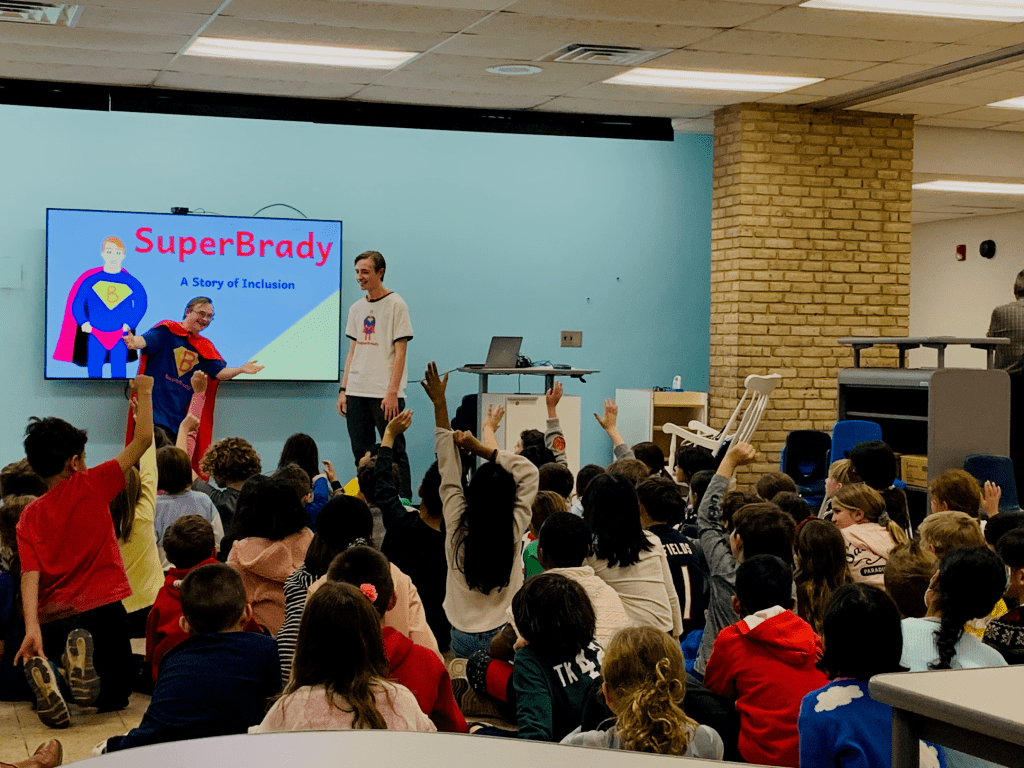 SuperBrady can be hired for Elementary School Author Assemblies where he presents his SuperBrady book about what it has been like growing up with Down syndrome and how important inclusion has been for him. He concludes with tips on how everyone can be a SuperHero of Inclusion and a Q&A session. For more information about Author visits both in-person or virtual, click SuperBrady Author Assemblies.