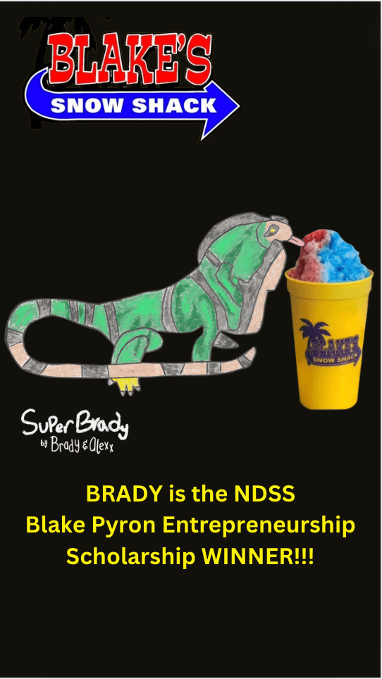 August 2024. 2024 Blake Pyron Entrepreneurship Scholarship Winner – Brady wins $500 to invest in his SuperBradyShop in recognition for his innovation as a business owner with Down syndrome. In appreciation, Brady draws this iguana enjoying one of Blake’s snow cones from Blake’s Snow Shack.